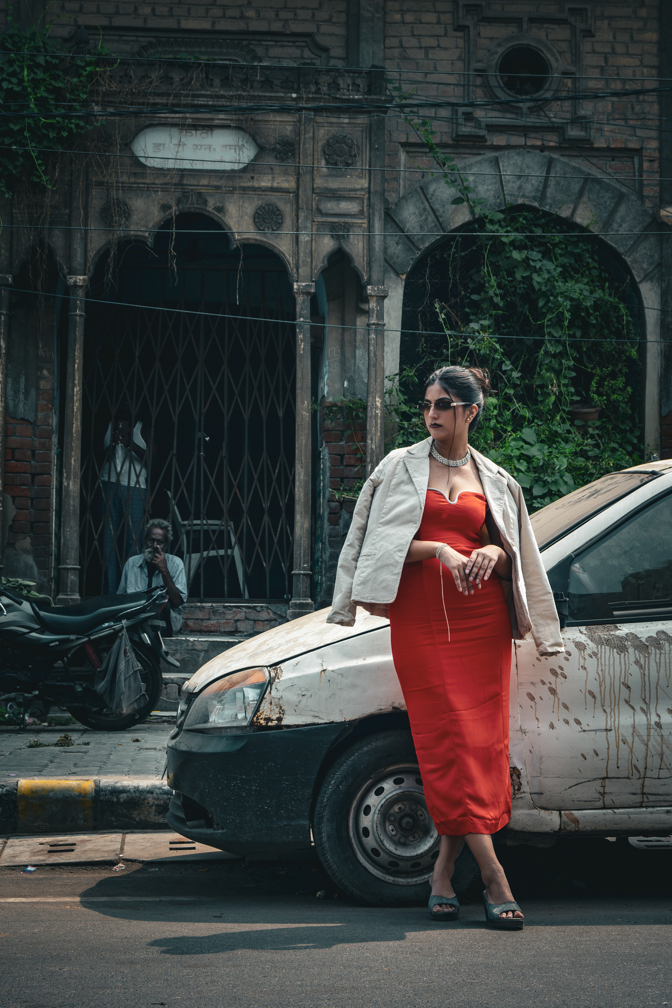 This image captures a striking interplay of contrasts-high-fashion meets the vibrant chaos of the old city. The model, styled in a bold red bodycon dress and an off-white jacket, exudes elegance and sophistication, accessorized with dark sunglasses and minimalist jewelry.