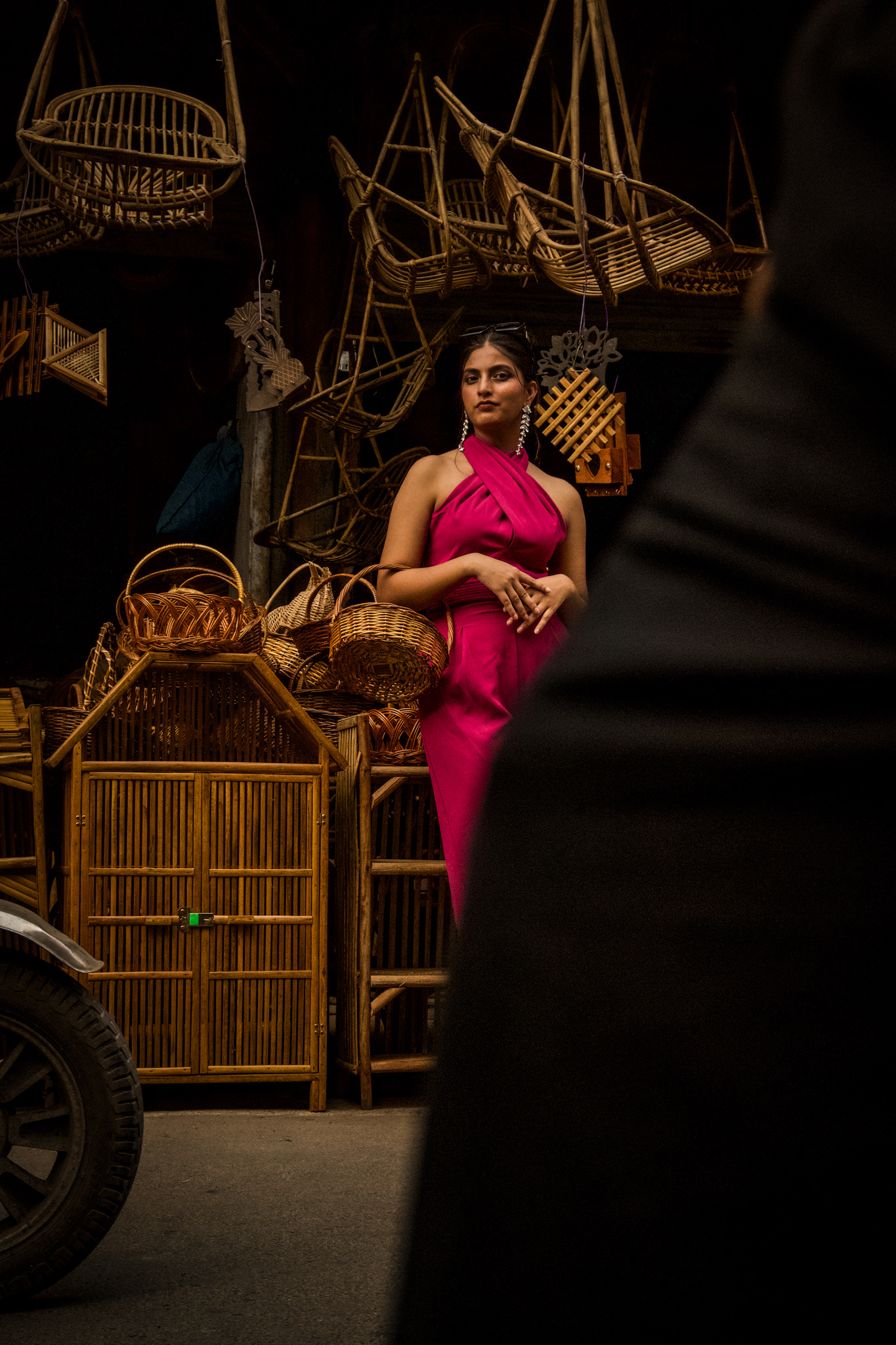 The model stuns in a vibrant purple halter dress, paired with statement earrings, while holding a handcrafted basket amidst a shop filled with woven crafts. The rustic setting contrasts beautifully with her modern, sophisticated look, celebrating the blend of high fashion and traditional artistry.