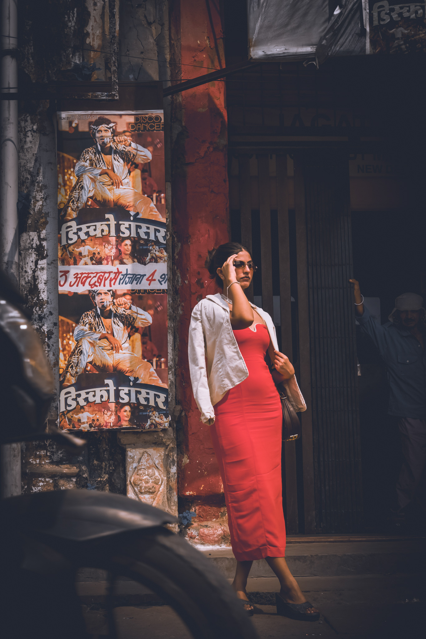 The retro Bollywood posters, worn walls, and passerby in casual attire highlight the cultural richness of the setting while emphasizing the stark contrast with the model's upscale styling.